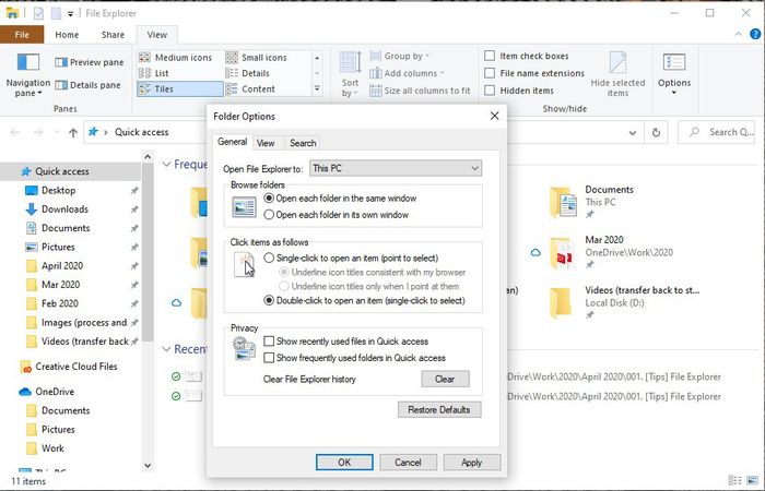 Bấm vào tab View > chọn Options > trong tab General, tại mục 'Open File Explorer to:', chọn This PC.Thêm các thư mục quan trọng vào Quick Access: