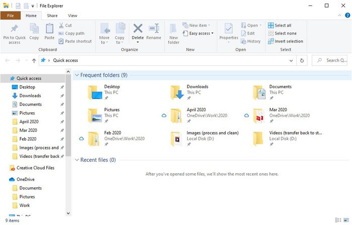 Khi mở File Explorer, thường sẽ hiển thị mục Quick Access như thế này. Mục này ghi lại các thư mục và file mở gần đây. Nhưng một số bí mật hoặc các thư mục riêng tư không nên để lộ ra. Nếu bị bạn gái hoặc vợ phát hiện, có thể sẽ gặp rắc rối. Ngoài ra, mục Quick Access này cũng không quen thuộc với những người dùng Windows lâu năm, họ thường muốn mở My Computer khi mở File Explorer. Cách chỉnh sửa như sau: