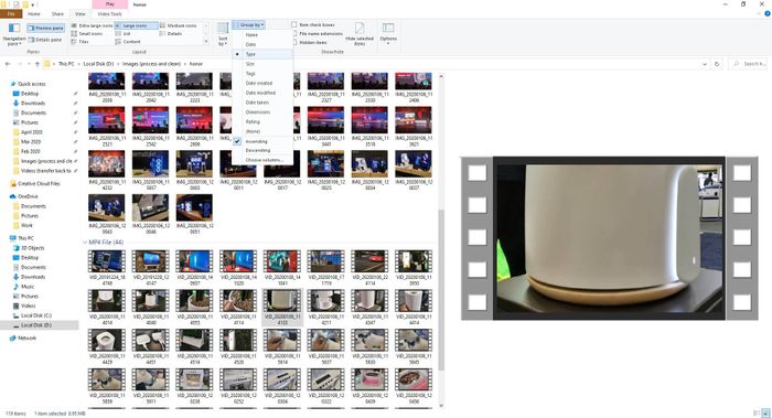 Trong tab View, bạn chọn Nhóm Theo > có nhiều lựa chọn như nhóm theo tên, ngày tạo, loại file, kích thước, … Mình thường sử dụng tính năng Nhóm Theo để sắp xếp các file trong thư mục theo từng loại, chẳng hạn ảnh ở phần ảnh, video ở phần video như trong hình. Nếu chỉ để ảnh nhỏ thì rất dễ nhầm lẫn giữa ảnh và video.
