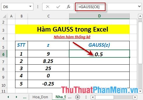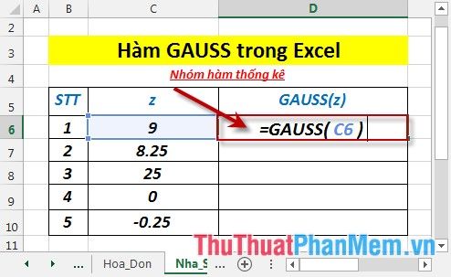 - Nhập Công Thức : =GAUSS(C6) Vào Ô Cần Tính