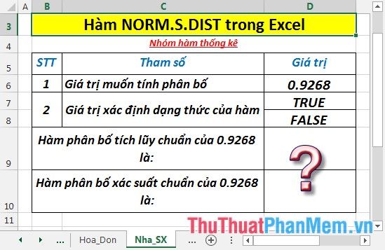 - Tính giá trị hàm phân bố xác suất chuẩn (tương ứng với giá trị False). Tại ô cần tính nhập công thức: =NORM.S.DIST(D6,D8)