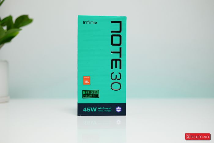 The box of Infinix Note 30 4G has a striking design with a dominant emerald green color. The box features the machine's name, along with the JBL logo and a 45W fast charging power indicator.