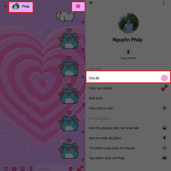 Bước 2: Mở ứng dụng, chọn cuộc trò chuyện muốn đổi chủ đề. Tiếp theo, ấn vào tên đối phương hoặc chữ i ở góc trên bên phải để truy cập menu cuộc trò chuyện. Tại đây, tìm và chọn mục Chủ đề.
