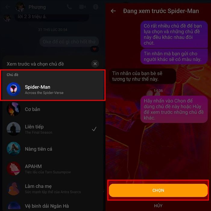 Bước 3: Ngay sau đó, bạn sẽ bắt gặp một loạt các chủ đề thú vị, trong đó chủ đề đầu tiên là về siêu anh hùng Spider-Man. Hãy chọn ngay nó để trải nghiệm bản xem trước. Hãy đảm bảo rằng nó phản ánh đúng phong cách của bạn. Nếu bạn quyết định chọn theme này, chỉ cần nhấn vào nút 'Chọn' và bạn đã xong. Lưu ý rằng nếu bạn chọn chế độ nền sáng, theme sẽ có vẻ khác biệt so với chế độ nền tối, hãy lựa chọn phù hợp với sở thích của bạn nhé.