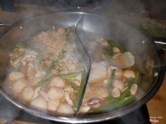 Món lẩu 2 ngăn cho bạn thưởng thức cùng lúc 2 hương vị lẩu Thái và lẩu gà nấm đậm đà. Không chỉ có hải sản và bò Mỹ mà còn có nhiều rau, mỳ, đậu hủ để nấu cùng.