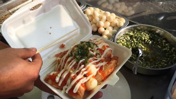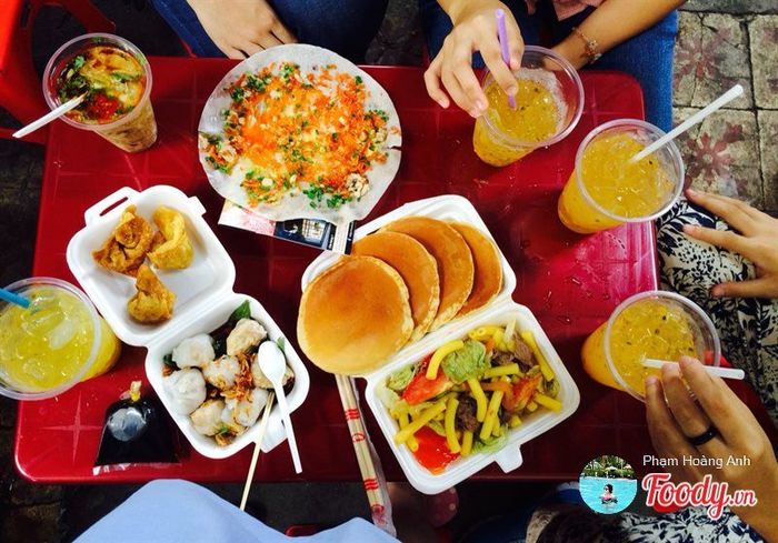 Đủ loại đồ ăn ngon từ bánh bạch tuột, đồ chiên đến cơm tấm và bột chiên, bạn có thể thưởng thức ngon lành cành đào tại đây. Ngoài ra, còn có trà sữa, sinh tố vừa ngon vừa rẻ để giải khát. Mỗi người chỉ cần dằn túi khoảng 20k-25k là đã có thể no đủ, đặc biệt từ 4h chiều trở đi có nhiều món ngon xuất hiện.
