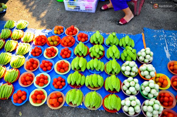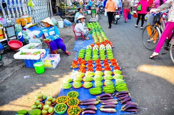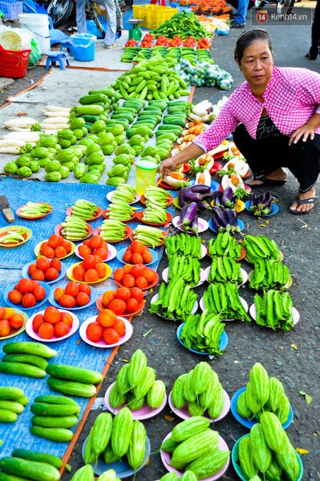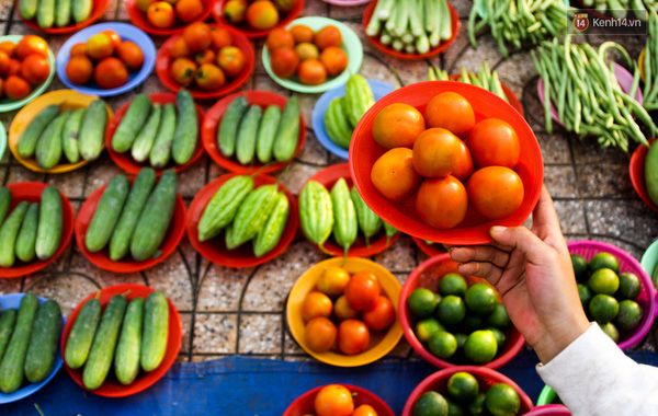Ví dụ như rau củ được chia thành từng nhóm nhỏ như dưa leo 7 quả/đĩa, cà chua 8 quả, đậu bắp 20 quả... xếp gọn gàng trên những chiếc đĩa nhựa. Thậm chí những mặt hàng nhỏ như ớt khoảng 10 quả (to bằng ngón tay út) cũng được gói thành chùm đồng giá 1.000 đồng/chùm.