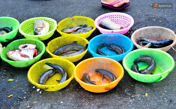 Cá được sắp xếp gọn gàng trong từng rổ để bán.