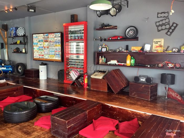 Quán được trang trí theo phong cách một Garage thu nhỏ, với bàn ghế được làm từ những bánh xe độc đáo. Khám phá nguyên bộ sưu tập 'siêu xe' mô hình tại quán, bạn sẽ không khỏi bất ngờ. Đây là nơi lý tưởng để check-in và chụp những bức ảnh độc đáo.