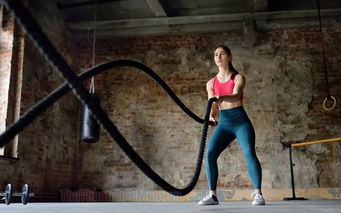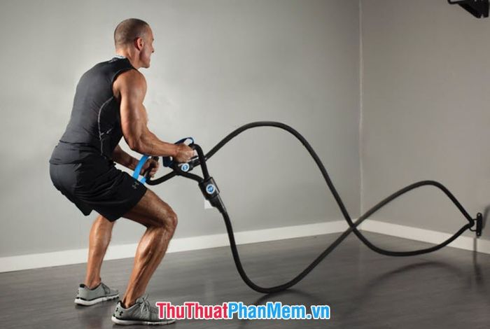 Battle Rope là một trong những dụng cụ 'thần thánh' được ưa chuộng trong phòng tập vì vừa hiệu quả vừa tạo nên vẻ 'ngầu'. Để thực hiện bài tập này, bạn cần chuẩn bị một đoạn dây thừng dài, đặt qua một cột hoặc móc trên tường. Cầm 2 đầu dây, đứng ở tư thế Squat và tạo chuyển động sóng.
