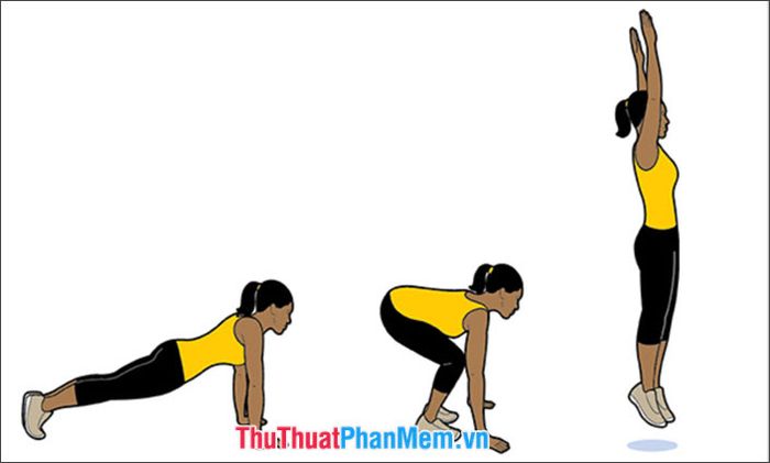 The Burpee là động tác đốt cháy calo mạnh mẽ, kết hợp nhiều động tác như chống tay, ngồi xổm và nhảy. Trong bài tập này, hãy giữ cho lưng thẳng và tránh cong để đảm bảo tập luyện an toàn và hiệu quả.