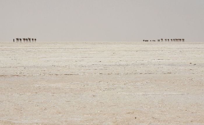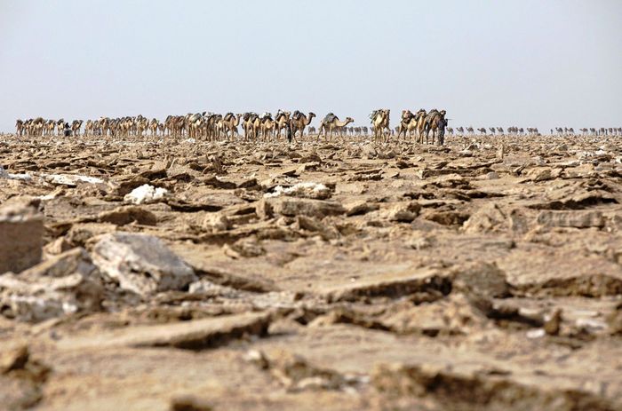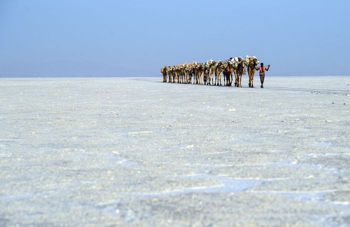 24. Hình ảnh đặc sắc của đoàn lạc đà bước vào khu vực khai thác muối tại Vùng trũng Danakil vào ngày 28 tháng 3 năm 2017.