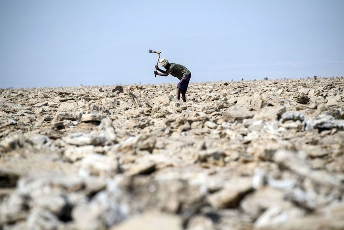 5. Một người thợ mỏ đang chiết tách muối dưới cái nắng chói chang ở Vùng trũng Danakil, Ethiopia.