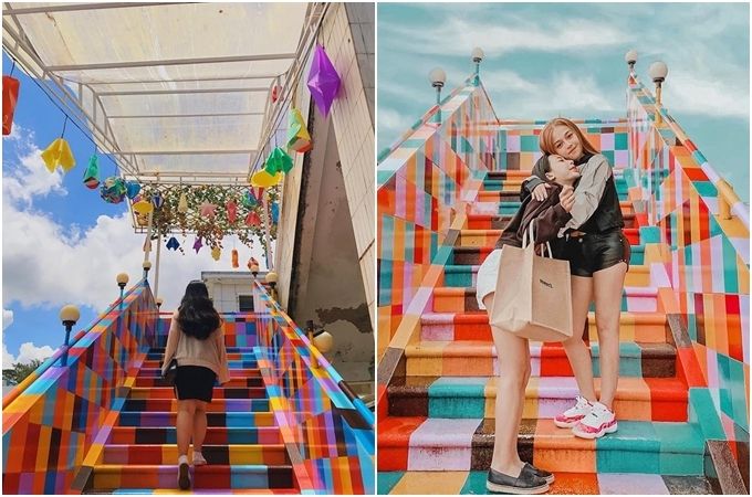 At the end of the bridge is a staircase leading to a café, BBQ spot on the rooftop of the old market - one of the hottest check-in spots on Instagram recently. The staircase is adorned with vibrant colors, against the backdrop of the blue sky, creating a magical photo spot. You can comfortably pose without worrying about the sun or rain thanks to the transparent canopy. Climbing plants, decorative lanterns sparkle at night, providing an ideal setting to admire the city's skyline.