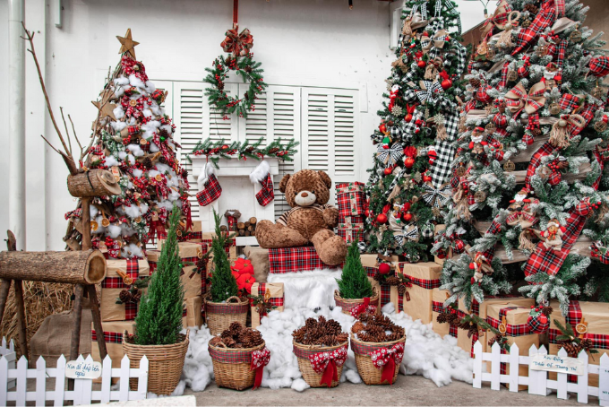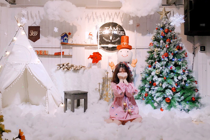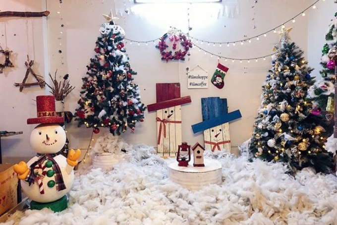 Decorating a coffee shop for Christmas with fake snow will be a distinctive focal point, attracting the attention of customers. You can choose to use foam, soap bubbles, cotton... to create fake snow scattered along the walkway or adorn on Christmas trees and dry branches.