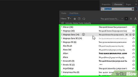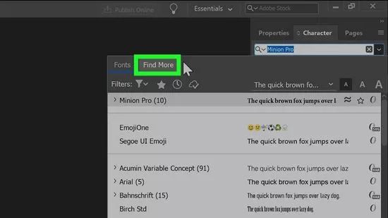 Click on Find More in the Character panel. If you can't see this tab, press ⌘ Cmd+T (on Mac) or Ctrl+T (on Windows) to open it. The Find More button is located just below the font selection menu.