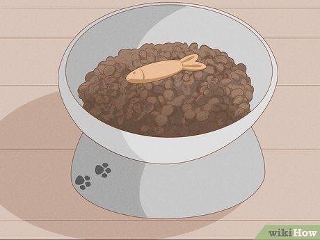 Add a special treat to your cat’s regular food. Sprinkle a few pieces of her favorite treat on top of her usual meal. If your cat is picky and doesn’t like them mixed, serve the treats in a separate dish next to her food bowl.