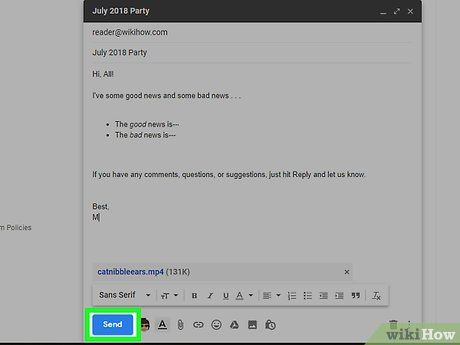 Click on Send. This blue button is located at the bottom right corner of the email window. The email will be sent to the specified address.