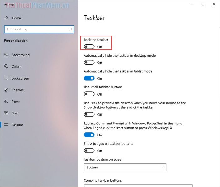Step 2: In the Settings window, proceed to turn off the Lock the Taskbar feature.