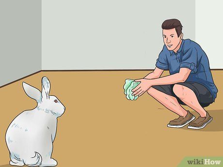 Sit on the floor close to your rabbit. Bring out healthy snacks like carrots or celery. Hold the treat in your hand and say, "[Rabbit's name], come here."