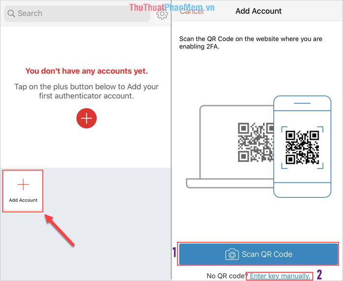 You can use Scan QR Code to scan the code (1) or use the Manual Entry method (2) if the software does not support QR codes.