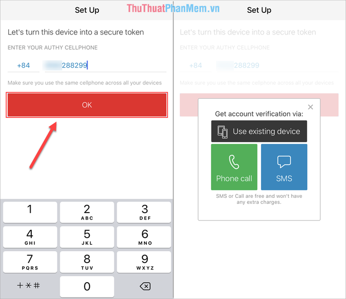Step 1: The first thing when using Authy is to verify your mobile number. As we are in Vietnam, select country code +84, enter your phone number, and press OK to complete.