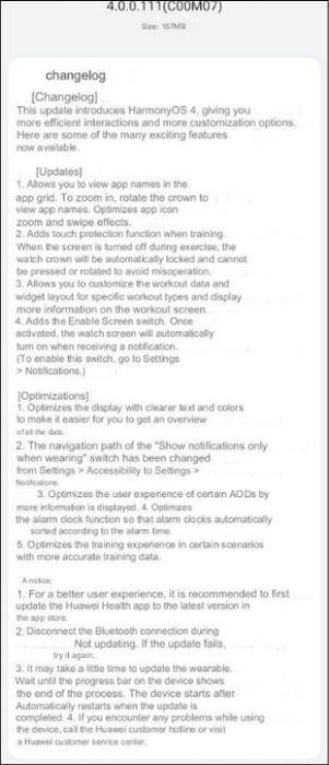 Bản cập nhật có dung lượng 157 MB, quá trình tải xuống và cài đặt có thể mất một ít thời gian - Hình minh họa: GSMArenaBản cập nhật có dung lượng 157 MB, quá trình tải xuống và cài đặt có thể mất một chút thời gian. Công ty cũng khuyến khích người dùng nâng cấp lên phiên bản mới nhất của ứng dụng Huawei Health trước khi thực hiện cập nhật phần mềm cho smartwatch.