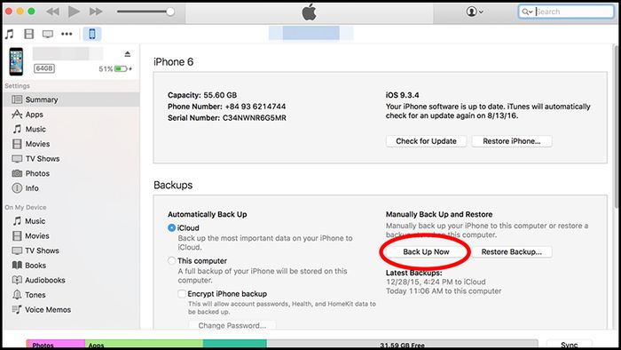 Sử dụng dây cáp để kết nối iPhone với iTunes trên máy tính > Bấm vào nút Back up now để sao lưu dữ liệu trên iPhone.
