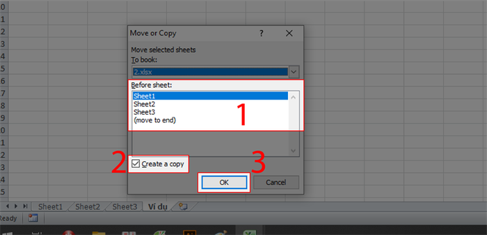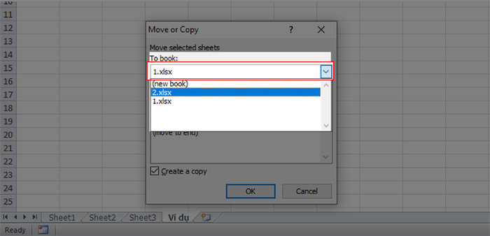 Bước 3: Lựa chọn vị trí muốn đặt sheet sao chép ở ô Before Sheet > Chọn ô Create a copy > Bấm OK để xác nhận sao chép sheet sang file Excel khác.