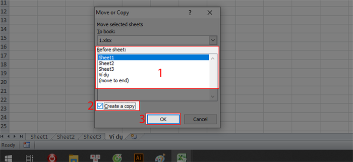 Bước 2: Chọn vị trí bạn muốn đặt sheet sao chép ở ô Before Sheet > Tick chọn ô Create a copy > Nhấn OK để xác nhận sao chép sheet.