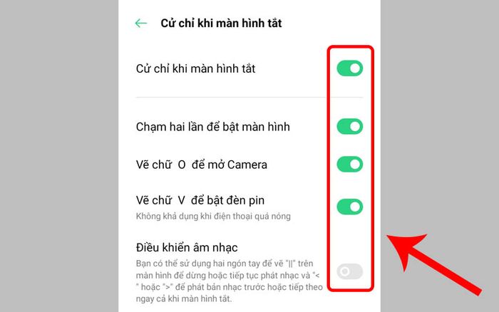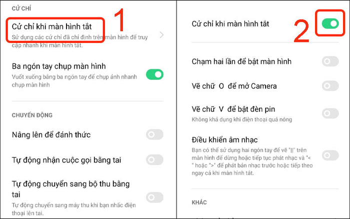 - Bước 2: Nhấn vào Cử chỉ màn hình tắt > Bật cử chỉ khi màn hình tắt bằng cách gạt thanh ngang sang phải.