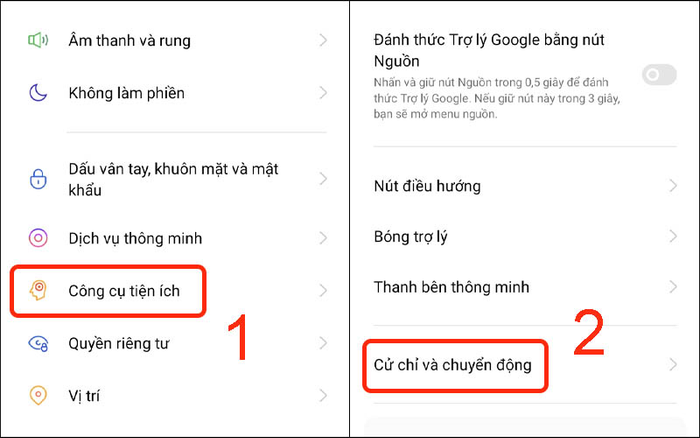 - Bước 1: Mở Cài đặt > Chọn Công cụ tiện ích > Mục Cử chỉ & chuyển động.