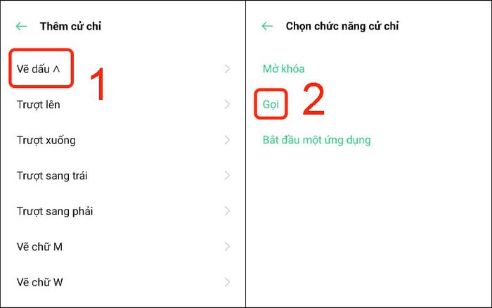 - Bước 5: Chọn từng cử chỉ để thay đổi chức năng > Chọn chức năng cho cử chỉ như Gọi, Mở khóa hoặc Bắt đầu một ứng dụng.