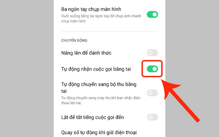 - Bước 2: Chọn Chức năng cuộc gọi thông minh (nếu có, nếu không, tiến hành bước tiếp theo) > Bật/Tắt Tự động nhận cuộc gọi qua tai nghe.