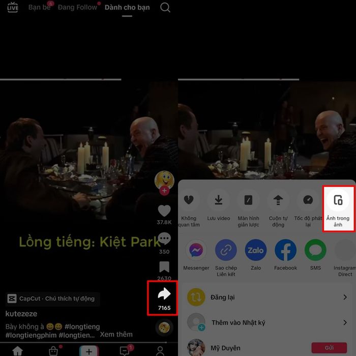 Bước 1: Mở TikTok trên điện thoại và chọn video muốn xem. Giữ ngón tay ở bất kì nơi trống nào trên màn hình. Khi bảng tùy chọn xuất hiện, kéo về cuối và chọn Ảnh trong ảnh.