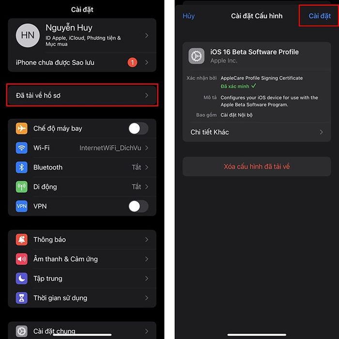 Bước 2. Truy cập vào Cài đặt > Chọn Hồ sơ đã tải về > Cài đặt cấu hình iOS 16 Beta Software Profile.