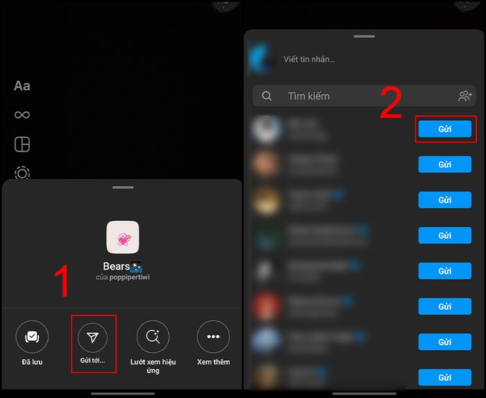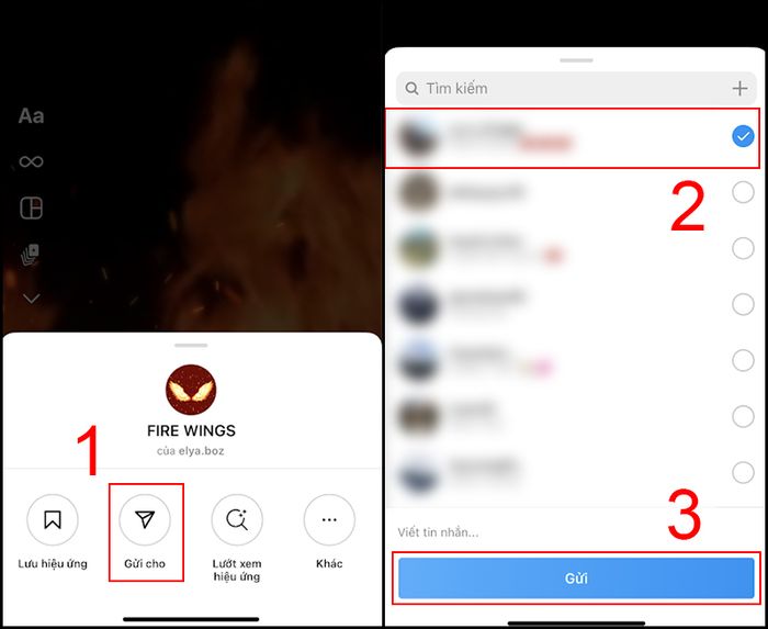 Tại đây chọn Gửi cho > Lướt chọn bạn bè cần gửi (hoặc bạn cũng có thể gõ vào ô tìm kiếm để tìm) > Tick vào chấm tròn tại tên người đó > Nhấn Gửi.