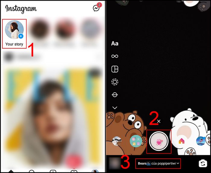 Mở ứng dụng Instagram trên iPhone của mình > Nhấn vào mục Tin của bạn (hoặc vuốt sang trái) để vào story > Chọn filter muốn chia sẻ > Nhấn vào tên filter phía dưới nút chụp.