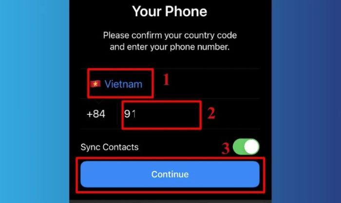 - Bước 2: Chọn quốc gia, nhập số điện thoại bạn đang sử dụng, sau đó nhấn Continue để tiếp tục.