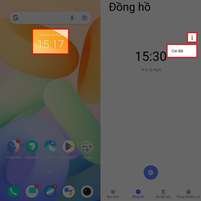 Bước 1: Trên màn hình chính của điện thoại, bạn sẽ thấy một đồng hồ lớn . Hãy chạm vào đó để mở giao diện đồng hồ. Trên đỉnh, bạn sẽ thấy biểu tượng menu 3 chấm đứng nhỏ, hãy chọn và bấm vào Cài đặt.