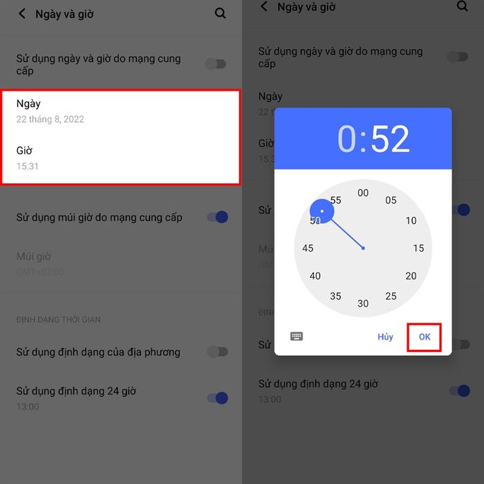 Bước 3: Cuối cùng, ấn vào Giờ để chỉnh giờ hoặc ấn vào Ngày để chỉnh ngày. Sau đó, đặt thời gian theo ý muốn và ấn OK là hoàn tất.