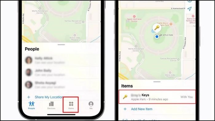Bước 1: Chạm vào phần Vật dụng (Item) ở cuối màn hình > Chạm vào tên của vật dụng (tên vật dụng được gắn AirTag).