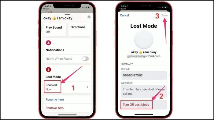 Bước 2: Chạm vào Đã bật (Enable) ở bên dưới Chế độ mất (Lost Mode) > Chạm vào Dừng Chế độ mất (Turn off Lost Mode) > Lưu (Save) là xong.