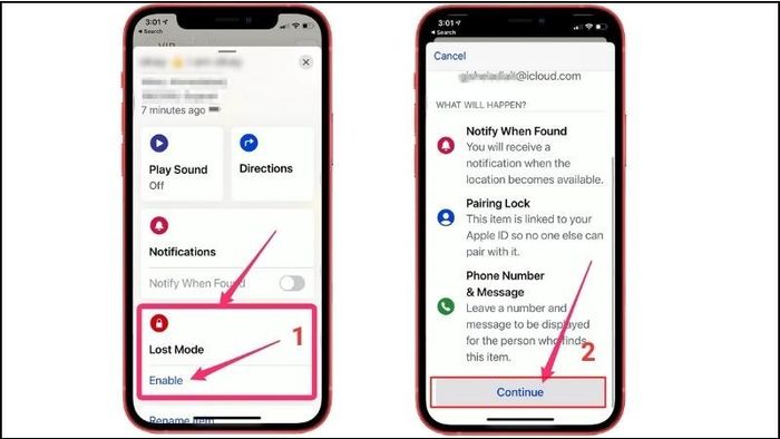 Chọn Bật (Enable) ở bên dưới Chế độ mất (Lost Mode) > Nhấn chọn Tiếp tục (Continue)