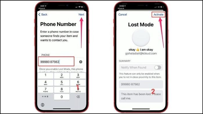 Bước 3: Nhập số điện thoại của bạn để người nhặt được có thể liên lạc với bạn > Chọn Next > Chọn Kích hoạt (Activate)