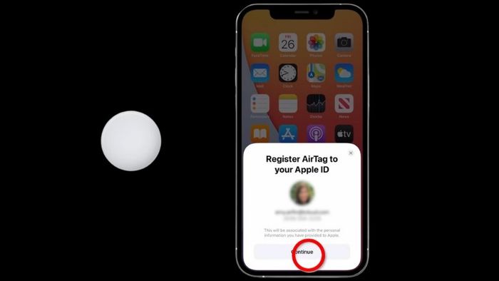 Nhấn tiếp Tiếp tục để đăng ký AirTag
