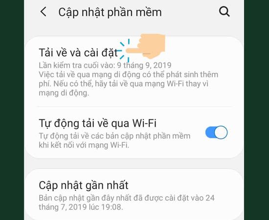 Mở Cài đặt -> Chọn Cập nhật phần mềm -> Nhấn Tải về và cài đặt -> Chờ máy kiểm tra bản cập nhật.