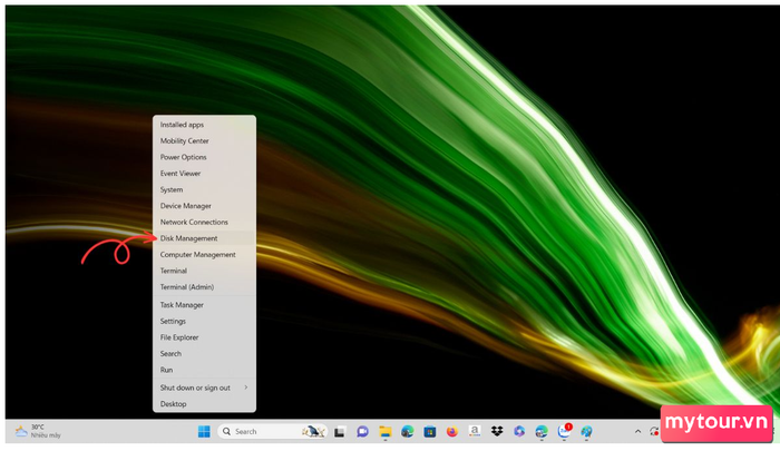 Bước 1:Bắt đầu bằng cách chuột phải vào biểu tượng Windows ở thanh Taskbar và chọnQuản lý ổ đĩaCam Kết