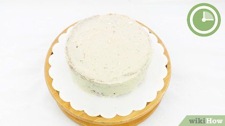 Phủ một lớp kem bơ mỏng lên bánh bằng dao pallet. Kem bơ sẽ làm cho fondant dính vào bánh nên bạn cần phủ đều lên toàn bộ bánh. Cố gắng phủ kem bơ sao cho thật mịn vì những cục kem bị vón sẽ hiện rõ khi trang trí. Nếu bánh có những đường rạn nứt hoặc lỗ thì dùng kem bơ để lấp đầy và phết cho thật mịn.