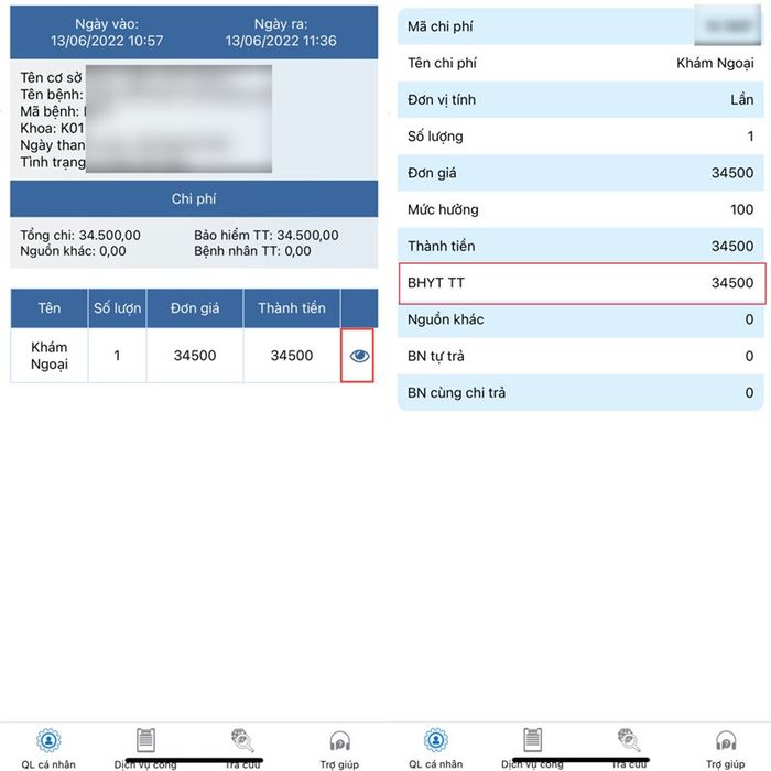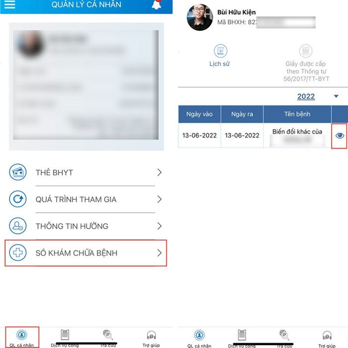 Bước 2: Chọn Sổ khám chữa bệnh trong Quản lý cá nhân, sau đó chọn Lịch sử. Tiếp theo, nhấn vào biểu tượng con mắt để xem chi tiết.